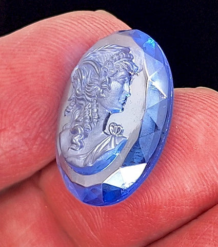 Light blue glass crystal cabochon, the edges of this are faceted and beveled to the front and the back. Quite thick measuring about 10mm tall. Not going to work in all settings. Prong cinch settings, deeper bezel settings, open back settings and wire wrapping are a good choice. A vintage piece no longer being produced. Made in Germany,