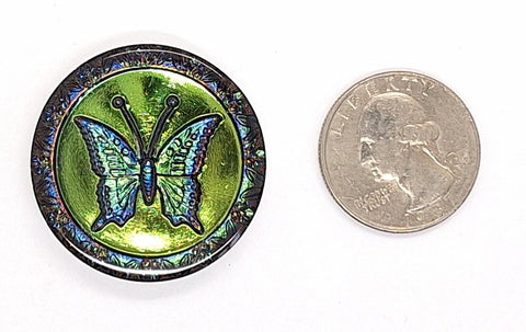 A beautiful piece. No longer made. As far as I know these may be the last available anywhere on the planet, Make a great centerpiece. This is all glass. Reverse Intaglio of a butterfly. It has a very colorful green iridescent sheen to it. Back is a silver metallic looking finish. It bevels toward the back along the edge. In other words the widest point is along the front edge slope inward a bit towards the back. This cabochon is flat on top and bottom, measures 6mm thick. Not sure if this was originally a jewelry piece. Possibly it was used as a centerpiece for something like a jewelry box, music box. I do not no its origins, Very cool. I have 10pcs of these at the writing of this listings. Also have another listing with a red tone butterfly.