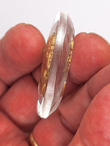 This is an Intaglio. The design itself is cut into the glass from the back. This is a clear glass piece so the design is then painted to stand out. The edges of this are faceted and beveled to the front and the back. Quite thick measuring about 9mm. About the same thickness as a gemstone. Not going to work in all settings. Prong settings and wire wrapping are a good choice.  A vintage piece no longer being produced. Made in Germany,
