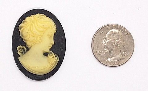The center is Ivory in color. The background is black. The size of the cameo is 40x30mm and is approximately 1-1/2x1-1/4 inches if you are not very familiar with millimeters. This is not an exact size in inches but is very close and gives you an idea of size.