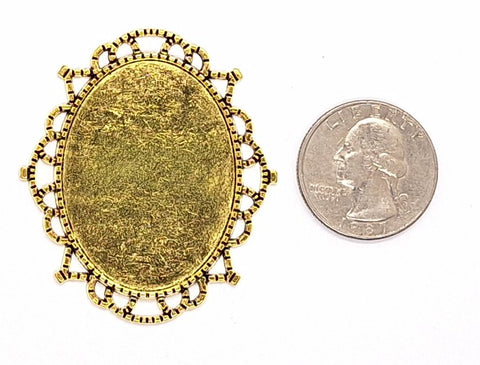 This is a cast cameo setting. It has an antique gold finish on it. There is no pin or bail on it. Plenty of places to attach to with the filigree work.